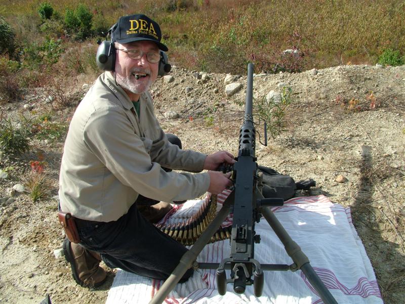 Today, for the first time, I got to see the entire NFA (National Firearms Act) collection of legal transferable machine guns that we now own. It is an impressive collection and one that will deliver many years of pleasure. Transferable machine guns have proven to be an excellent investment as well. Due to changes in the law, there are a limited amount of them available and the demand is not going down. For the first time, I got to shoot one of my Thompson Submachine Guns. What a treat! You see so many in gangster movies but to actually legally own one and shoot it. And the best part, no one is shooting back! Here is a photo of me shooting my first magazine. We also have two large capacity drums, one holds 50 rounds and the other 100.